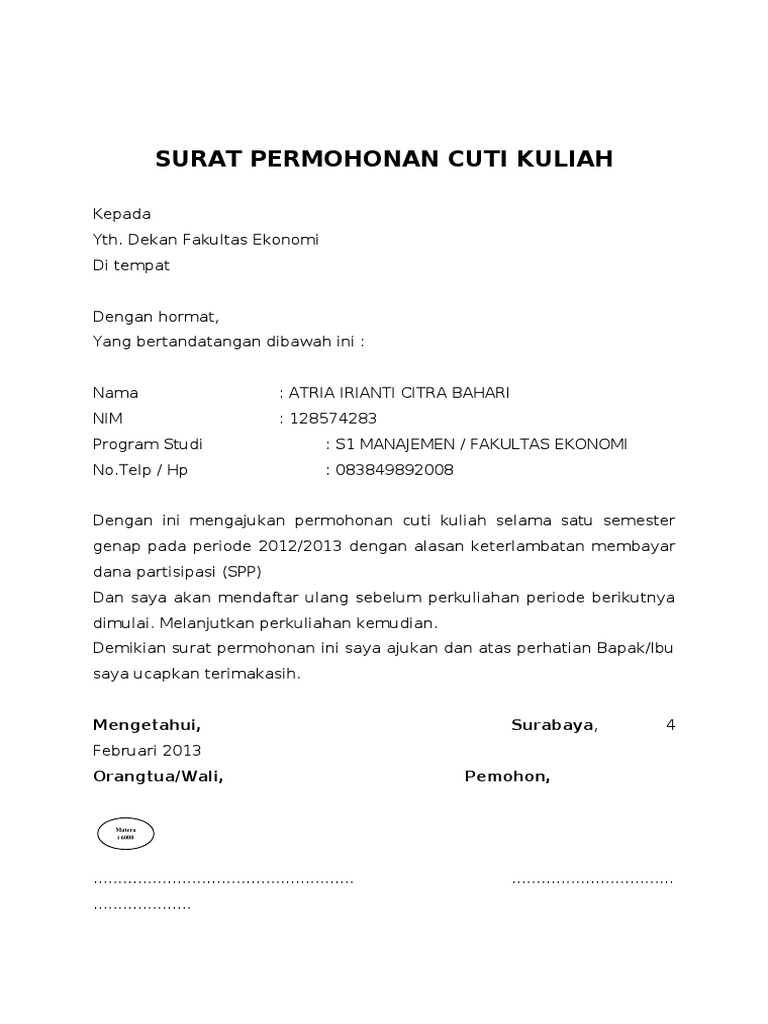 . Contoh surat permohonan cuti kuliah doc picture uploaded ang published by admin that kept inside our collection. Dekan Fakultas Hukum. Surat keterangan lunas pembayaran dari keuangan 2.